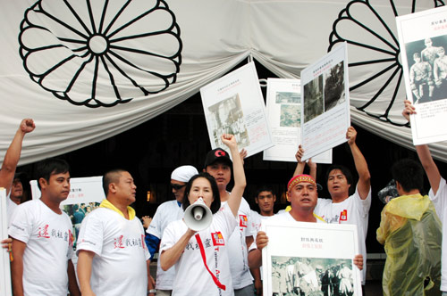 资料图:2009年8月11日,高金素梅(拿麦克风者)率领“还我祖灵队”约50人首度成功“突袭”进入日本靖国神社正殿前的大广场。 “中央社”图