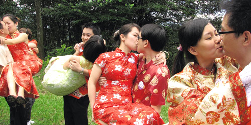 七夕情人节,宁波市20对新人情定日月潭,还在植树纪念后,由新郎抱起身着旗袍的新娘热情拥吻,羡煞旁人。