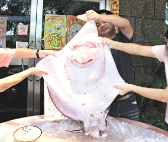 餐厅老板林庆昌表示,与餐厅配合的海钓船本月15日在恒春外海捕获1条长158公分、宽76公分、重38斤的母鱼,前半身像乌贼、后半身有长尾,但没有刺,浑身柔软,还有一般鱼类少见的卵袋,他经营海产餐厅多年,没见过这种鱼。