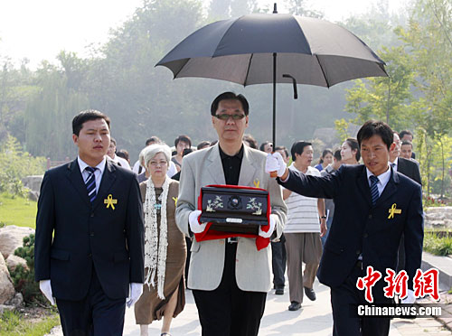 9月12日,台湾著名作家柏杨骨灰在河南新郑福寿园陵园下葬,实现了柏杨希望百年之后能够叶落归根,安息在中原故土的生前遗愿。图为柏杨儿子郭本城移灵父亲骨灰前往墓区。中新社记者 王中举 摄