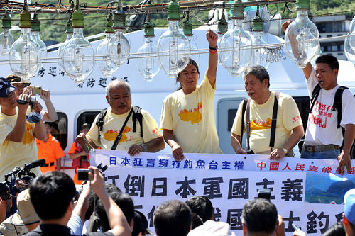 9月13日,台北县野柳港,台湾中华保钓协会联合香港与澳门的保钓人士出航前高呼反日口号。