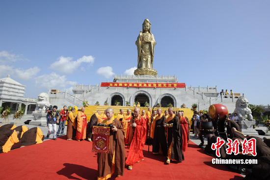 浙江普陀山上的巨大观音圣像一直是佛教信众们的心灵家园,这里金沙环绕,与宛若佛陀横卧的珞珈山隔海相望。17日上午,该圣像之下,整齐地摆放了千尊观音金身佛像,在普济寺方丈道慈法师和来自台湾高僧大德主持下,一场为即将远赴台湾的千尊观音圣像开光仪式显得格外隆重。