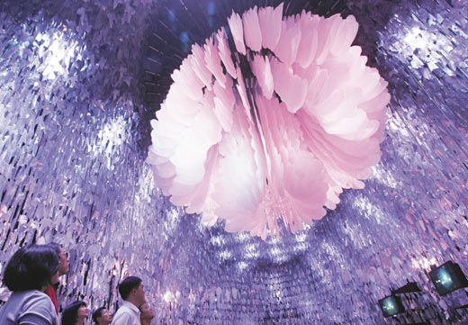 台北市长郝龙斌(右)昨天前往花博“梦想馆”巡视。“梦想馆”大厅上方宽达6公尺的动力机械花朵“绽放”(上方粉红部分),周围配上34000片纸叶片串接的森林隧道,在叶片型纸喇叭发出的虫鸣鸟叫声中,加上绚丽灯光烘托,就像进入一座魔幻森林。