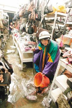 台风造成高雄大淹水,高雄市后火车站服饰街泡水,店家急着抢救。图片来源:台湾《联合报》