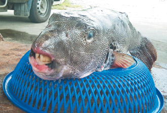 这条被渔民捕获的暴牙怪鱼,原来是罕见的“星斑叉鼻鲀”。(图:台湾《联合报》)