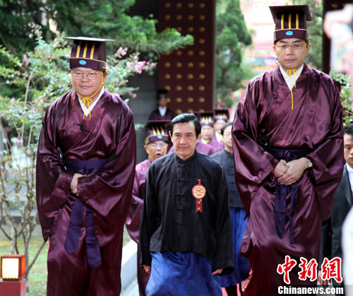 9月28日是中国伟大的思想家、教育家、儒家学派的创始人孔子诞辰2560周年。图为台湾地区领导人马英九(中)当日清早自台北孔庙中门进入孔庙,参加祭孔释奠典礼。 中新社记者 陈立宇 摄