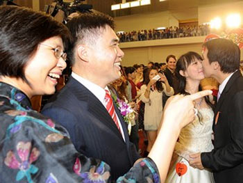 据台湾“今日新闻网”报道,台北市政府10日下午举行“花现台北2010联合婚礼”,台北市长郝龙斌与夫人高阆仙现身为140对新人证婚,并祝福新人“幸福久久、十全十美、双双对对、万年富贵”。