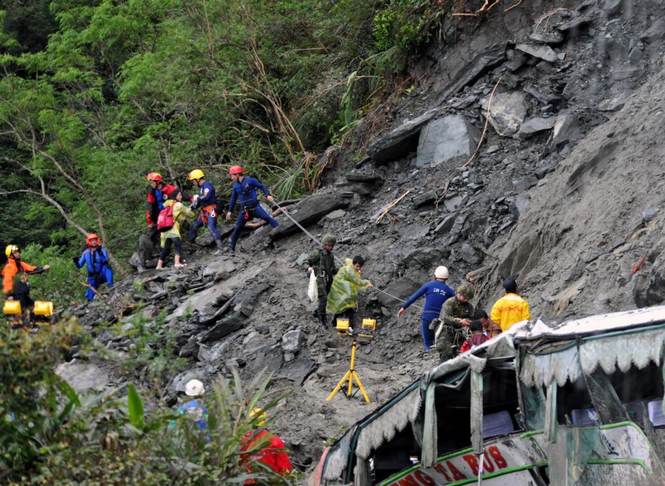 10月22日,游客在塌方现场被陆续救出。当日因台风导致台湾苏花公路塌方而被困的100多位大陆游客陆续被救出安置,另有23人失去联系,50多人等待救援。新华社记者 何俊昌 摄