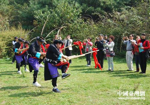 台湾媒体采访团与当地苗族人民一起跳芦笙长鼓舞(图片来源:贵定县台办)