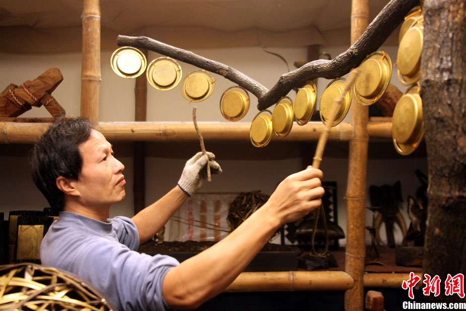 在台北乌来乡深山之间,住着一位被誉为“铜锣达人”的铜艺铜雕名家吴宗霖。乌来是泰雅族的传统集居地,吴宗霖虽无泰雅族血统,却是自小生活在这里,与泰雅族乡亲为伴。已与铜锣结缘30年的吴师傅,称铜锣就是自己一辈子的修行。图为吴宗霖在他自制的“编锣”前演奏《龙的传人》。 中新社记者 王健 摄