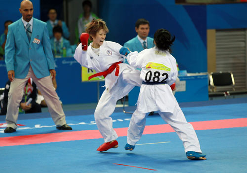 广州亚运会24日下午进行空手道女子50公斤级铜牌战,中华台北队选手陈彦卉(中)对决韩国选手张昭英(右),双方使尽全力拼战,气氛相当火爆。 图片来源:“中央社”