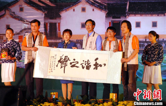 12月2日晚,在广西贺州举行的首届客家文化旅游节两岸文艺界联谊晚会上,两岸音乐人共奏“和谐之声”,洋溢同胞亲情,感动现场大批观众。图为联谊晚会上,两岸文艺人士互赠礼物。 中新社发 廖祖平 摄