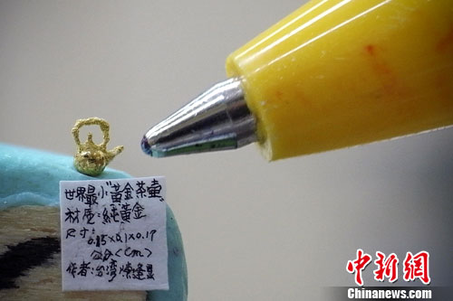 12月20日,两岸民间博物文化交流在北京举行,台湾著名微雕家陈逢显带来两件世界上最小的“黄金茶壶”发表。这两件作品历经两个月时间创作完成,创作过程中失败了数十次。这次以黄金为材料创作微雕作品,创造了世界最小的黄金茶壶作品,是雕刻技法的新突破。