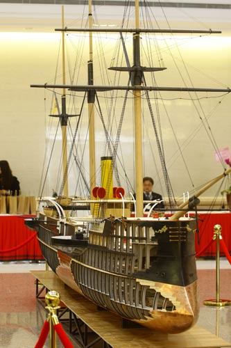 “福建船政-清末自强运动的先驱”特展22日在长荣海事博物馆举行记者会,特别邀请大陆模型师傅组装大型解剖模型船“开济”号。图片来源:台湾“中央社”