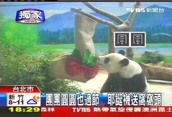 据台湾TVBS报道,过圣诞节的传统习俗,是在长袜里放惊喜礼物,来台湾2年的大熊猫团团圆圆,今年应景过起圣诞节,收到一个特制的大圣诞袜,里面全是它们爱吃的胡萝卜、窝窝头等点心。