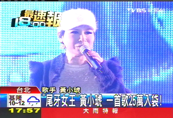 中国台湾网1月9日消息 据台湾TVBS电视台报道,春节临近,台湾企业的尾牙活动一场接一场,艺人们则跟着大捞一笔,谁是企业最爱的艺人?“灭绝师太”黄小琥以超过30场封后,堪称“尾牙女王”。其中,参加日盛金控一场尾牙活动,她只唱了4首歌就赚了100万(新台币,下同),平均一首歌入账25万,共唱了40分钟,1分钟净赚25000元。