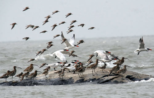 金门进入冬季赏鸟季节,来自北方的候鸟纷纷飞抵栖息渡冬,尤其天气愈冷,鸟况愈好,成为最夯的生态旅游活动。大金门东北角官澳海边,7日即出现鸥科、鹬科的鸟群翱翔于海上,共谱冬季恋歌。 图片来源:“中央社”