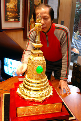 这座舍利塔高56厘米、宽28厘米,从底座到上方共雕刻数百朵大小莲花、云朵等精细纹饰,还有3座佛陀佛光普照及12片菩堤叶图样,并镶有红宝石、祖母绿及钻石等,造型之精致世间罕见。