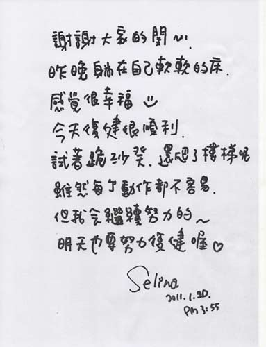 Selina遭烧伤近3个月,不仅对她本身是一个大考验,对家人和未婚夫来说也是个煎熬,所幸这一切都已过去,Selina挺过困难终于出院。据报道,Selina回到家安顿后,特地写信谢谢大家关心,Selina在信上说道:谢谢大家的关心,昨晚躺在自己软软的床,感觉很幸福。此外她还透露复健状况,表示复健很顺利,试着跪在沙发上,还爬了楼梯,虽然每个动作还不容易,但会继续努力。信的最后还画上了一个笑脸。(中国台湾网 吴斌)