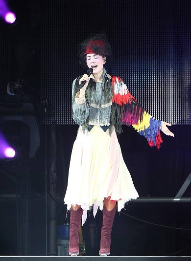 冬来了,春天也不远了。王菲接着换上鲜艳的红帽搭上黑色纱网,还站上升高近2层楼的舞台,挑战自己的惧高症,卖力演唱;到夏天的场景时则是一身浅绿色上衣配粉红色裤子,俏丽时尚。