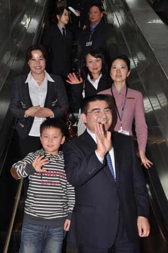 大陆企业家陈光标(右)26日晚间率团搭机抵台,他的妻子(左)及儿子(中)也同行。 图片来源:“中央社”