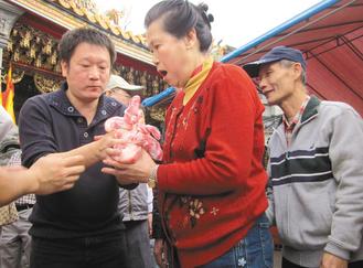 另外,永福岩清水祖师庙昨天也庆祝清水祖师公诞辰。土城区永福岩清水祖师庙顾问刘湘麟献的神猪重1580台斤(1台斤为1200克),比三峡清水祖师庙的冠军神猪还重了37台斤。昨天下午刘免费分送神猪肉给民众,以保平安,庙前大排长龙。(中国台湾网 冯存健)