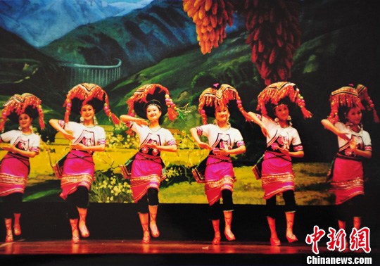 2月24日,应台湾高雄市海峡两岸经贸文化交流协会邀请,由四川省台办、凉山州政府组织的“四川民族歌舞交流团”启程,赴台湾中南部地区进行为期九天的交流演出。行前,有关方面在成都举行了简短的启动仪式。图为赴台演出节目剧照。中新社发 凉歌宣 摄