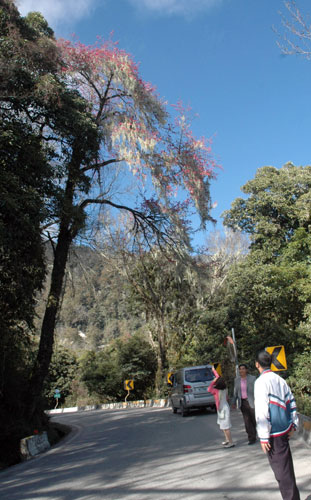 台湾南横公路向阳游乐区附近的百年原生种樱花古树已经陆续绽放,苍劲树干、艳红的花朵,披上地衣,给人不同的感受。 图片来源:“中央社”