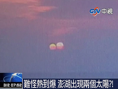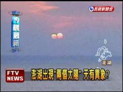 据报道,台湾网络近日疯传一组澎湖“两个太阳”的奇异照片。照片当中,好像真的出现两个太阳,相偎相依,网友称之为奇特的“太阳双胞胎”景象。有网友表示,“莫非太阳也有分身术,难道天真有异象吗?”