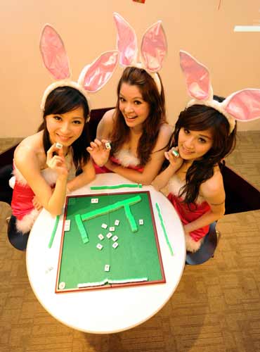 台湾一知名网络购物中心24日邀请“政大四姬”中的高玉颍(左起)、柯念萱及沈易儒,以桃红兔女郎装扮向大家拜早年。图片来源:“中央社”