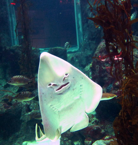 台湾屏东海洋生物博物馆世界水域馆的巨藻缸,有一种叫“环吻犁头鳐”的鱼,腹部器官的排列,看起来像是一张微笑的人脸,常让游客啧啧称奇。图片来源:“中央社”