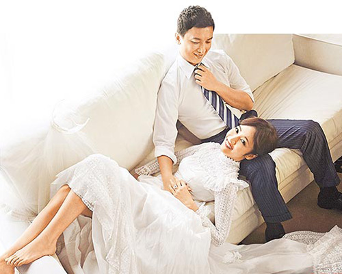 侯佩岑婚纱曝光,躺在沙发上与未婚夫黄伯俊心手相连,场面温馨甜蜜。图片来自网络