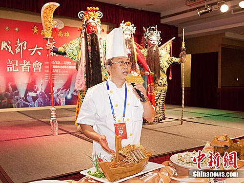历史悠久的“成都大庙会”将于5月20日起在台湾高雄文化中心圆形广场连办3天,以四川最具代表性的民间工艺、歌舞杂技、川剧变脸、特色小吃等,向台湾民众呈现天府之国的人文历史与民俗风情。图为5月19日的记者会上,厨师展示麻辣美食。中新社发 路梅 摄