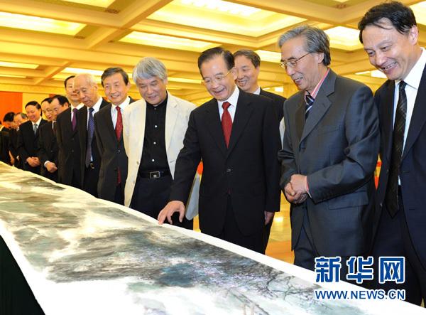 上午9时许,温家宝总理来到人民大会堂,出席中央文史研究馆成立60周年座谈会。座谈会前,温家宝在几位主创画家的陪同下,兴致勃勃地观赏了这幅巨作。