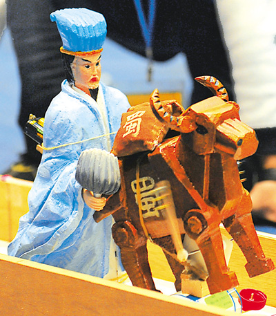 四川成都红砖西路小学学生制作的“诸葛亮木牛流马”在参加直线竞赛。