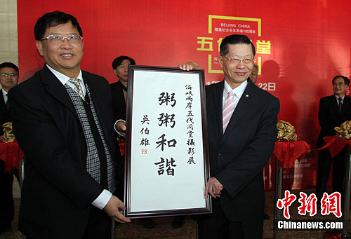 12月17日,五代同堂——海峡两岸摄影名家精品联展在北京中华世纪坛开幕。影展展出了自百岁老翁郎静山、吴印咸、……直至年仅20多岁当代摄影青年学生郭丽娜的200多幅精品力作,从郎静山大师的《百鹤图》起始,到宋长青先生的《百麋图》结束。组委会征选了20世纪以来的中国老、中、青五代200位摄影家的精品之作,藉此寓意“百和·百美”。将参展摄影名家以年龄为序分为五代,并冠名“五代同堂”则深含期盼中华民族的和谐与复兴,携手共谋中国民族化摄影新繁荣的深刻寓意。据悉,本次影展将在中华世纪坛中心展厅持续展出一周,并于明年开春移步台湾巡展。