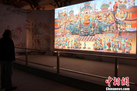 图为大屏幕在播放《阿弥陀净土经变图》。董会峰摄