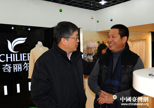 中国台湾网1月10日上海消息 日前,上海市台办巡视员季平来到位于嘉定区工业区的台资企业、上海奇丽尔制衣有限公司,亲切慰问董事长陈进贤,陈佐际、宋惠明等随同参加。陈进贤介绍了近年企业经营、进步发展的概况,并对今年市场作了预测。