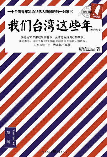 2009年初冬,一个台湾青年写给13亿大陆同胞看的一封家书《我们台湾这些年》风靡大陆,销售火爆,作者透过自己的人生经历,以年份为坐标,从1977年自己出生的那年开始,以轻松文笔向大陆读者介绍自己所认识的台湾社会和政治。已在而立之年的作者用浅显的手法,讲述30年来台湾政治巨变下老百姓自己的故事。正如该书封面说言:读完本书,你会了解台湾人30年来的真实生活和心路历程。只想感叹一声:大家都不容易!