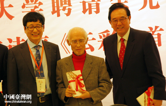 20日,台湾诗人余光中受聘担任北京大学“驻校诗人”。图为余光中(中)受聘后与海协会会长陈云林(右)合影。(中国台湾网 张瑞宸 摄)