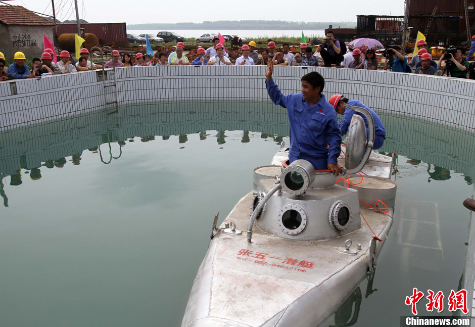 5月8日,武汉下岗工人张五一自制的一艘潜水艇下潜到4.5米深的水池底部,成功进行水底捕捞渔业产品、打捞物品等多项水下作业试验。今年37岁的张五一高中学历,下岗前在一家机械厂上班,一年前成为一家潜艇制造厂的厂长,自造潜艇。该艇出厂价在20万元左右。已有收到三张订单,客户准备采购其潜艇用于采集海产品。 图为5月8日,武汉下岗工人张五一自制的一艘潜水艇下潜前向围观的人群招手致意。张畅 摄