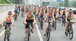 昨日,株洲60多位自行车爱好者,赤膊上身涂着彩绘骑行全城,倡导“低碳、环保”的健康生活理念,为奥运助威。他们中的17位还将前赴宝岛台湾进行为期十三天的环台湾骑行。“我们想用这种行为艺术来宣传低碳与环保,倡导绿色的出行方式。”队员们表示。谭平华 张平 摄影报道