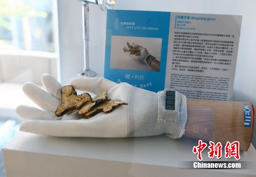 14日,台湾知名工业设计大赛“光宝创新奖”在台北揭晓,浙江大学学生朱宁宁和林书丹的作品“秤重手套”获金奖,并获得35万元新台币的高额奖金。图为金奖作品“秤重手套”。