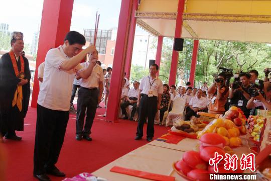 10月13日上午,为期3天的2012台北客家义民嘉年华在台北市客家文化主题公园开幕。图为“安座大典”上,台北市长郝龙斌作为主祭官,在神坛前上香,敬拜义民爷。杨杰 摄