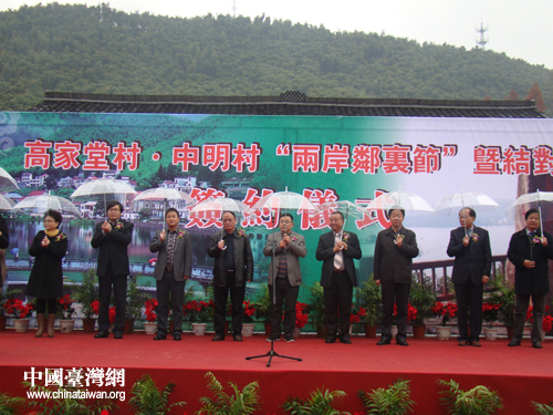 在高家堂村·中明村“两岸邻里节”暨结对签约仪式上,湖州安吉县山川乡高家堂村村委会主任潘小众说,因为台湾中明村是乡村旅游,现代农业比较不错的地方,我们想跟他们学习一下,借鉴一下,今后多交往多交流。台湾南投县鱼池乡中明村村长杨昆欣表示,以后要进一步来互相互动,发展观光和产业。仪式上,两村签订了“缔结友好村协议”和“妇女组织友好结对协议”。随后举行了座谈会,两村就相互情况进行了交流。两村村长也亲手合力种下了“友好树”。