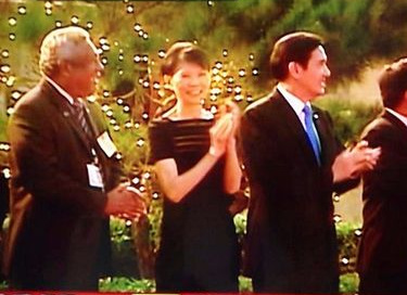 马英九与王金平两人说好一起戴帽子,但周美青往右一看,王金平戴的好整齐,再往左一瞥,马英九的帽子歪了,马上动手帮马英九弄好,就怕失礼,动作宛如像在教小孩。