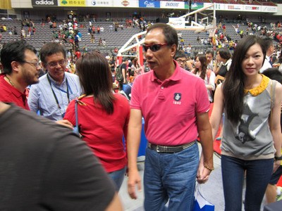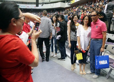 美国职篮(NBA)休斯敦火箭队与印第安纳步行者13日在台北举行热身赛,鸿海集团董事长郭台铭(前右)与 妻子曾馨莹(前右3)出席观赛,引起注目。 图自台湾“中央社”