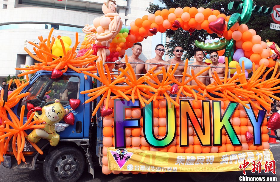 10月26日,号称亚洲最大规模的“同志”(同性恋者)大游行下午在台北登场,数千人走上街头,精心打扮争奇斗艳。图为游行前“同志们”在台北市政府广场前集结。陈立宇 摄