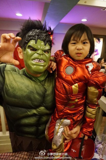 中国台湾网10月31日消息 据台湾媒体报道,今天是万圣节,林志颖与儿子Kimi未能免俗也玩起角色扮演,林志颖扮成绿巨人,Kimi则是钢铁人,两人还玩起对打,爸爸林志颖理所当然得成为儿子的手下败将。网友看了直呼好可爱,也觉得Kimi好幸福,有个好爸爸。(中国台湾网 朱炼)