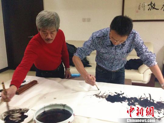 北京台湾艺术交流座谈会10月31日举办,两岸艺术家交流经验,现场挥毫泼墨。图为两岸艺术家合作绘画。曾鼐摄